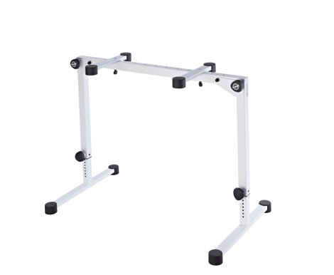 A kisméretű acélvázas konstrukció és a nagy padlóvédő lábak a mutatós billentyű állványnak kivételes stabilitást biztosítanak. A rugós rögzítő gombok mindkét oszlopon egyszerű és precíz magasságbeállítást tesznek lehetővé. A hangszertartó karok egyenként a hangszer méretéhez igazíthatók.