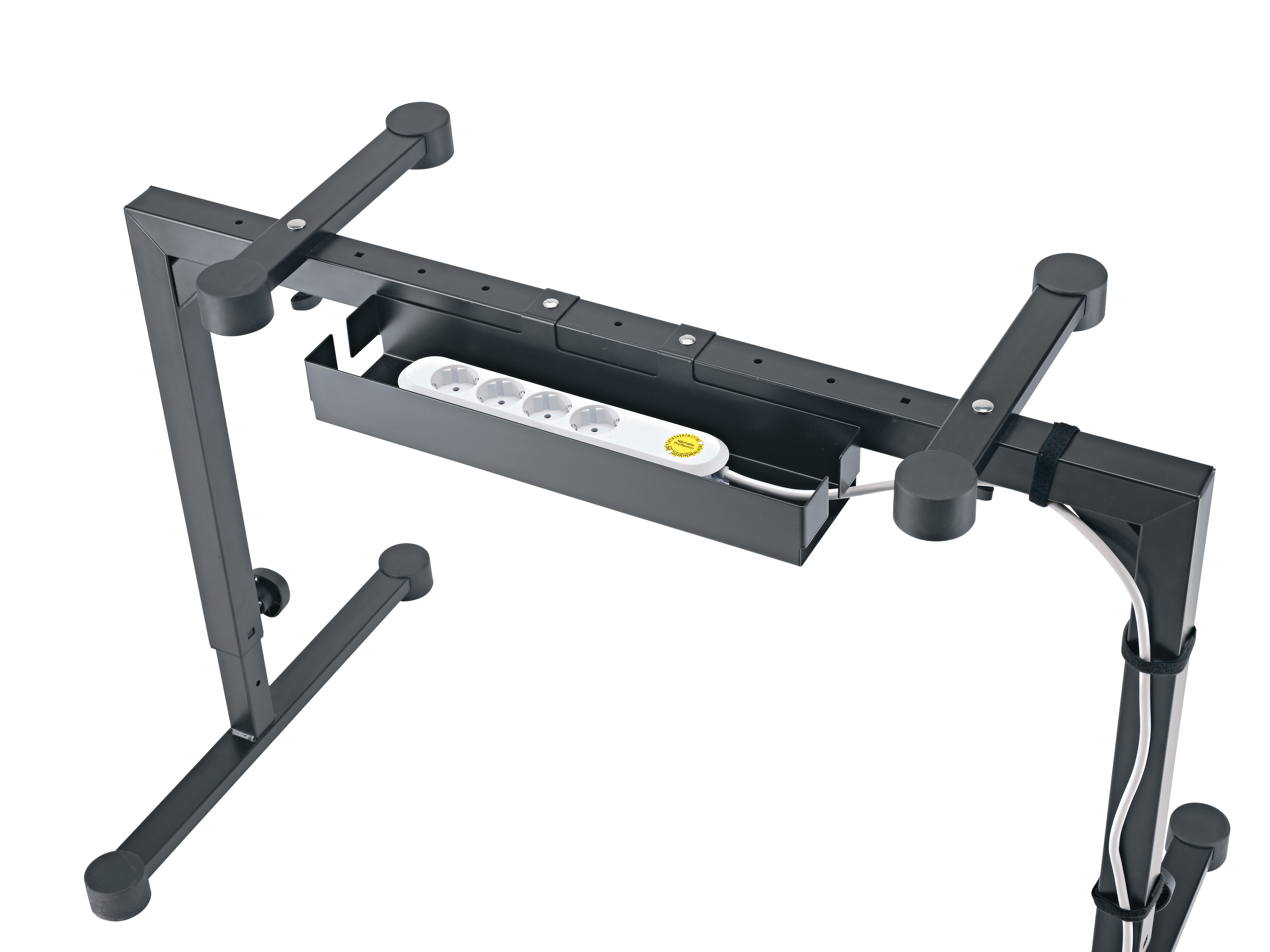 A König & Meyer jóvoltából végre vége a kábel-káosznak. A masszív, acéllemezből hajlított praktikus kábelrendező dobozt két csavarral pillanatok alatt felakaszthatjuk az Omega billentyűállvány kereszttartójára. A doboz használható például elosztóhoz vagy hosszabb kábelekhez, rendezett, helytakarékos módon. Az oldalsó nyílások elegendő helyet biztosítanak a kényelmes kábelvezetéshez.
