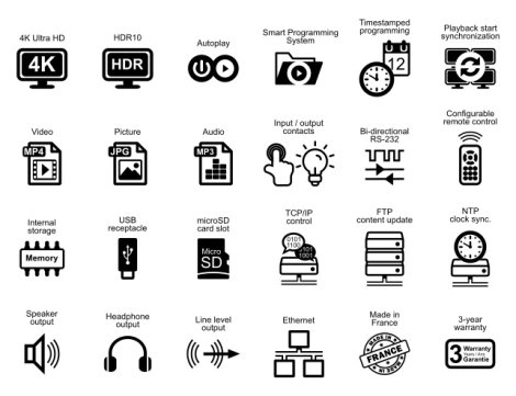 Amikor a lejátszót bekapcsoljuk, pontosan végrehajtja az előre megírt forgatókönyvet. Vezérelhetjük a készüléket Ethernet segítségével, lejátszhatjuk a tartalmat egy pontosan meghatározott időben, irányíthatjuk a lejátszást a nyomógombok vagy érzékelők használatával és számos készüléket alkalmazhatunk egyidejűleg a szinkronizálási funkcióknak hála.