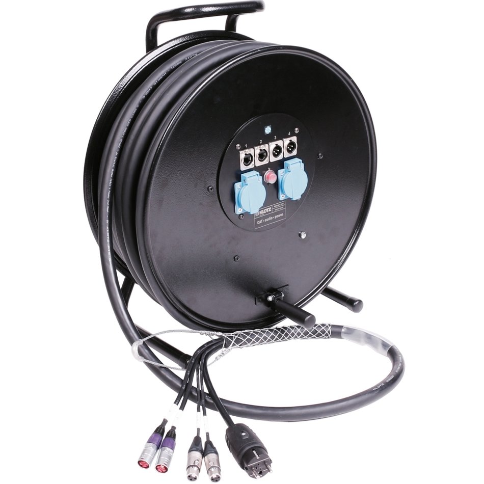 Hibrid kábeldob rendszer 2 CAT, 2 audió/DMX és egy táp kábellel, etherCON, 3-pólusú XLR és Schuko csatlakozókkal