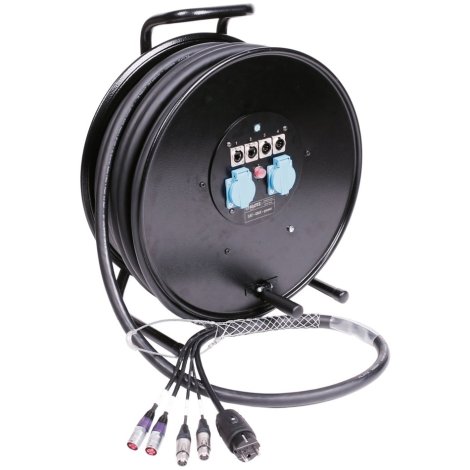 Hibrid kábeldob rendszer 2 CAT, 2 audió/DMX és egy táp kábellel, etherCON, 5-pólusú XLR és Schuko csatlakozókkal