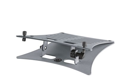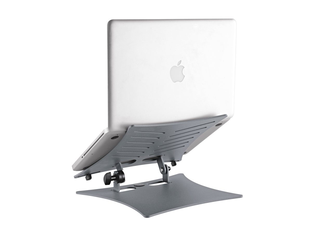 Vonzó megjelenésű, csinos laptop állvány szürke porfestéssel. A formás talp acélból készült, a tartólap pedig alumíniumból. A fogazott zsanérnak köszönhetően a dőlésszög állítható, a laptop kényelmesen kezelhető, az állvány pillanatok alatt kinyitható és összecsukható. Összecsukott állapotban lapos, az opcionálisan megvásárolható 12199 típusú szállítótáskával kiválóan megfelel a mobil DJ-knek és zenészeknek.