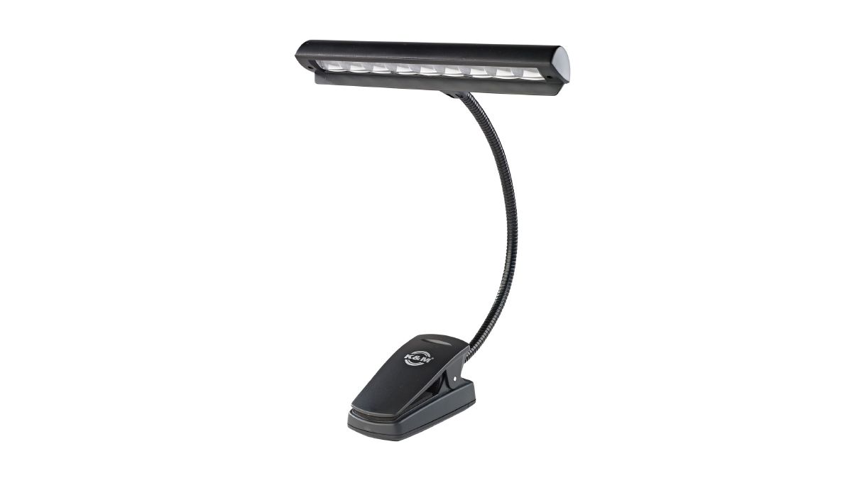 A professzionális zenekari kottapult lámpa elemmel és hálózati tápegységgel működik. A beépített kilenc extra fényes és energiatakarékos LED egyenletes és élénk megvilágítást biztosít. A hajlékony gégenyak minden irányban állítható. A lámpa fényereje két fokozatban kapcsolható. A tükrözésmentes lámpaernyő a kottalapra irányítja a fénysugarat. Az extra erős csíptető biztos tartást nyújt a kottapulton.