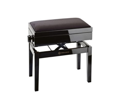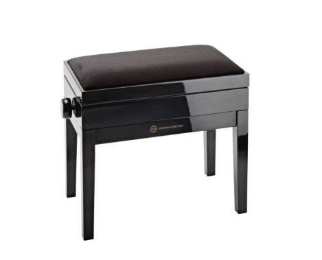 Komplett zongoraszék ülőpárnával és beépített kottatárolóval. Tömör európai bükkfa négy rétegű magasfényű fekete poliészter lakkozással. Stabil lábak csúszásmentes gumi végekkel. Kettős kereszttartó mechanizmus a könnyű és precíz magasságállítás érdekében. Masszív ülőpárna MDF anyagból fekete bársony borítással. Lapra szerelve szállítják, egyszerűen összerakható.