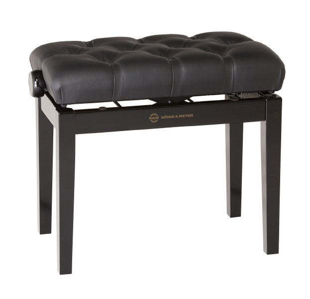 KM-13980-200-21 Zongoraszék, tűzött fekete bőr ülőpárnával, magasfényű fekete lakkozással