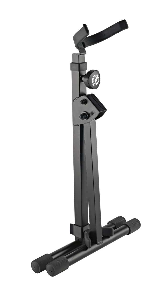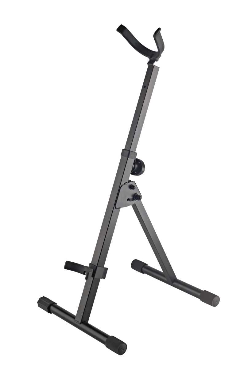 Az erős fém konstrukció biztonságosan helyén tartja a szaxofont. A hangszerrel érintkező részek teljes egészében gumírozottak, védik a felületet a karcolásoktól. A felső tölcsértartó magassága 12 lépésben állítható 650 mm és 920 mm között. Az alsó tartókar bármely hangszerhez egyedileg, fokozat nélkül állítható. Az állítható gumi lábvégek billegésmentes elhelyezést biztosítanak. A kiváló minőségű porfestés is bírja a strapát.