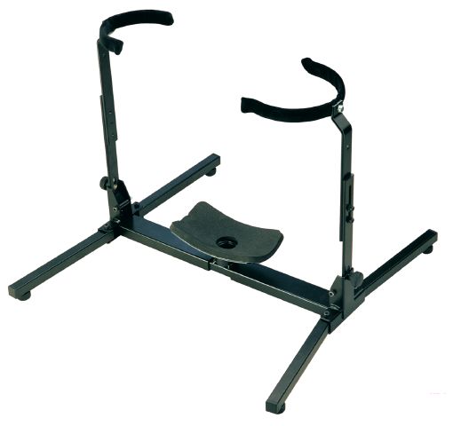 Stabil állvány biztos tartást adó lábakkal. Könnyen szétnyitható, összecsukható, ekkor mindössze 450 mm méretű. A támasztókarok magassága és szélessége állítható, bársonybevonatot kaptak. Nagy alsó tartóelem, amely nem karcolja a hangszert, mélyedés a hangszer gerince számára.