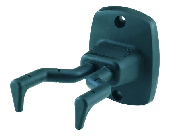 Csavaros rögzítésű fali gitártartó, amely számos gitártípushoz, aszimmetrikus kialakítású nyakhoz is alkalmazható. Szabadalmaztatott beakasztó és rögzítő mechanizmus, amely gyorsan és kíméletesen fogja a gitár nyakát. A gitár nyakának a rögzítő elembe való helyezésekor az automatikusan rögzíti és lezárja, kiemeléskor pedig elengedi. A tartóelem gumival bevont, végén lévő kampók további védelmet jelentenek. A talpazat kiváló minőségű műanyagból készült.