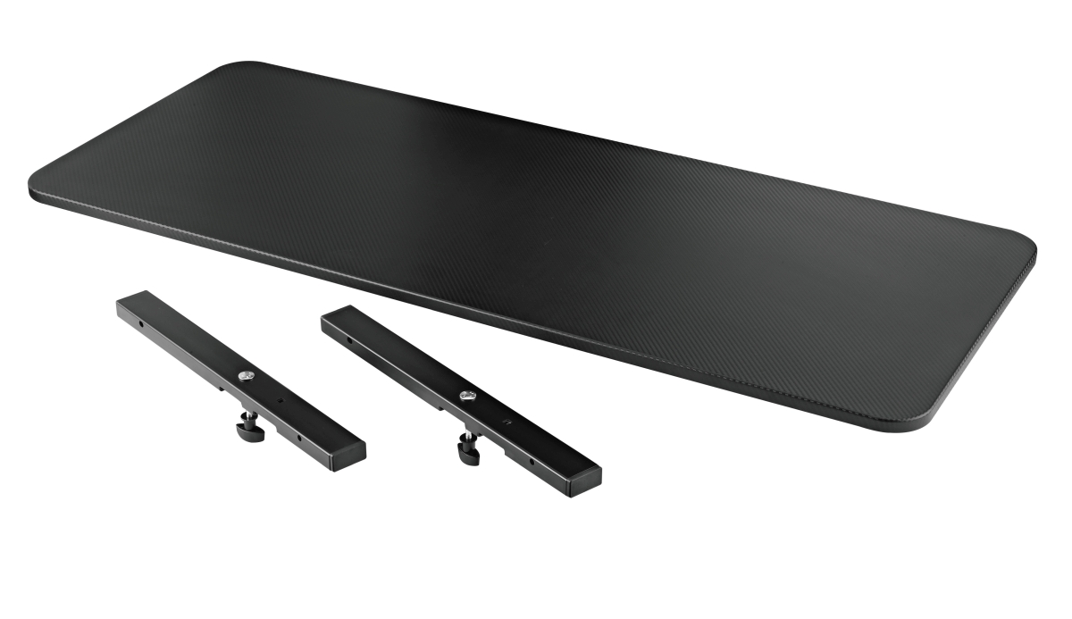 Néhány pillanat alatt a billentyűállványt 450 x 1100 mm-es DJ pulttá alakíthatjuk. A 15,5 mm vastag MDF tábla 30 kg terhelést bír el, az alsó felén négy gyorskioldó gomb található. A készlet tartalmazza a tartókarokat és szerelési anyagokat az állványra való rögzítéshez.