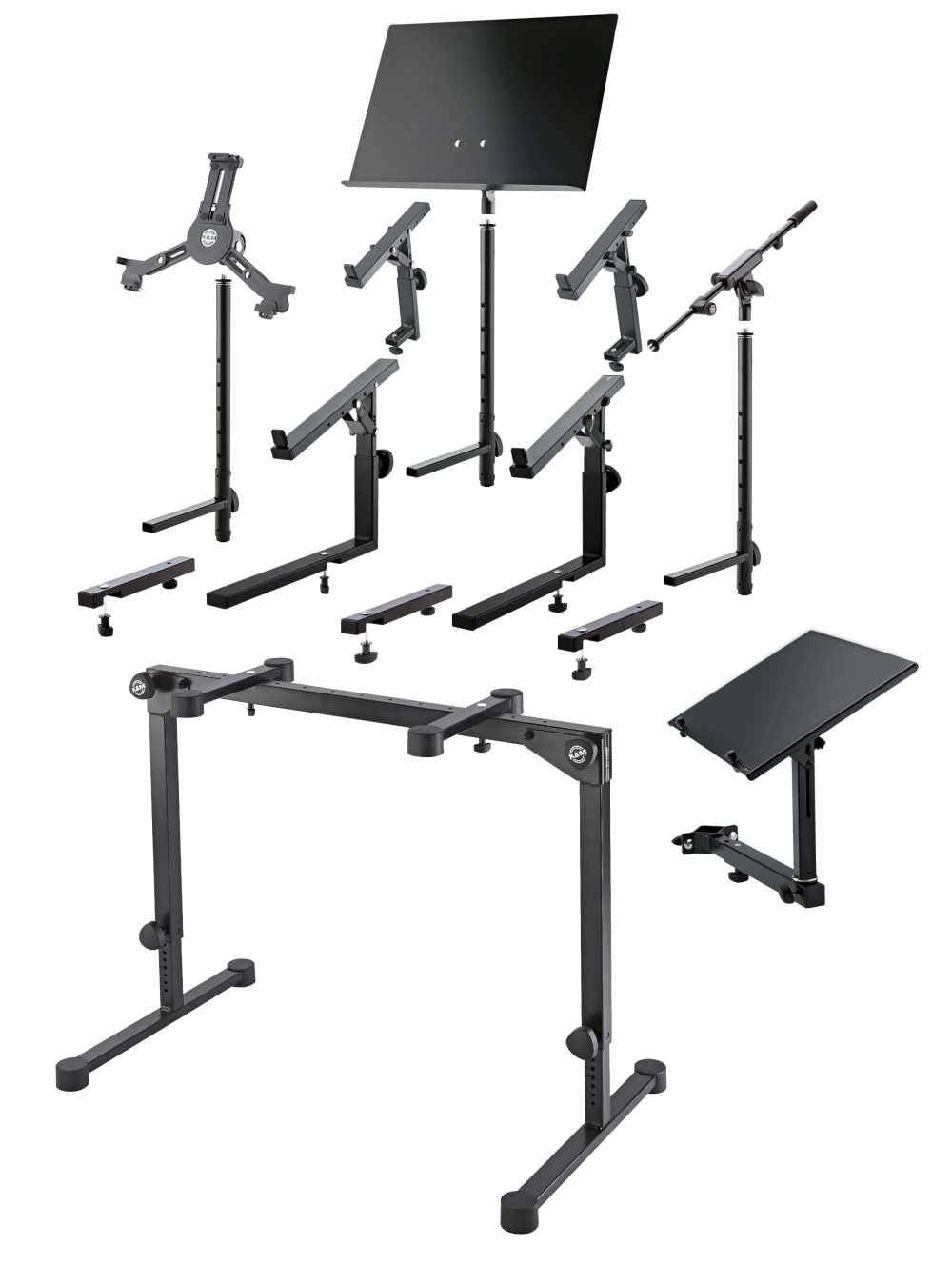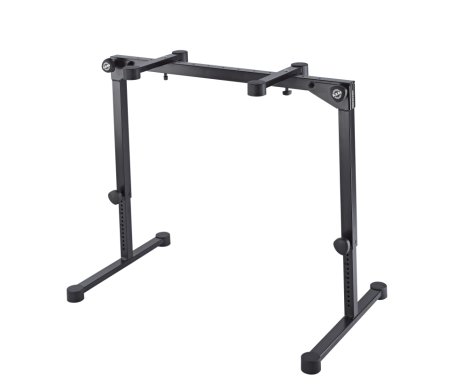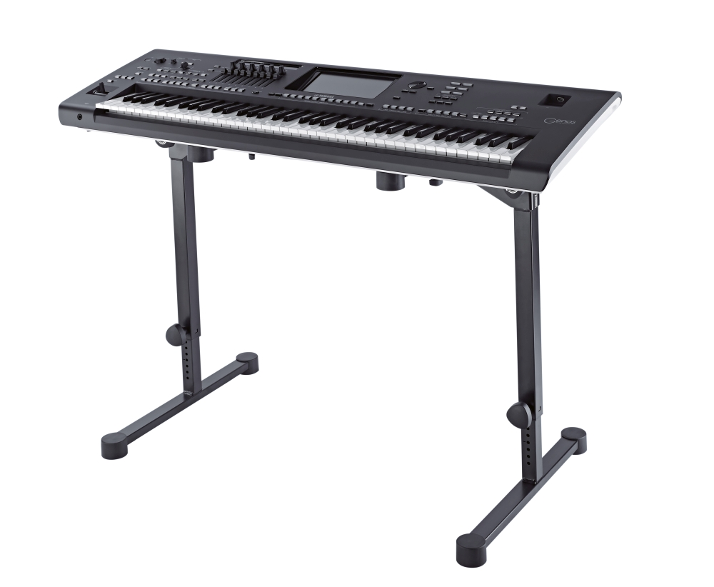 A kisméretű acélvázas konstrukció és a nagy padlóvédő lábak a mutatós billentyű állványnak kivételes stabilitást biztosítanak. A rugós rögzítő gombok mindkét oszlopon egyszerű és precíz magasságbeállítást tesznek lehetővé. A hangszertartó karok egyenként a hangszer méretéhez igazíthatók.