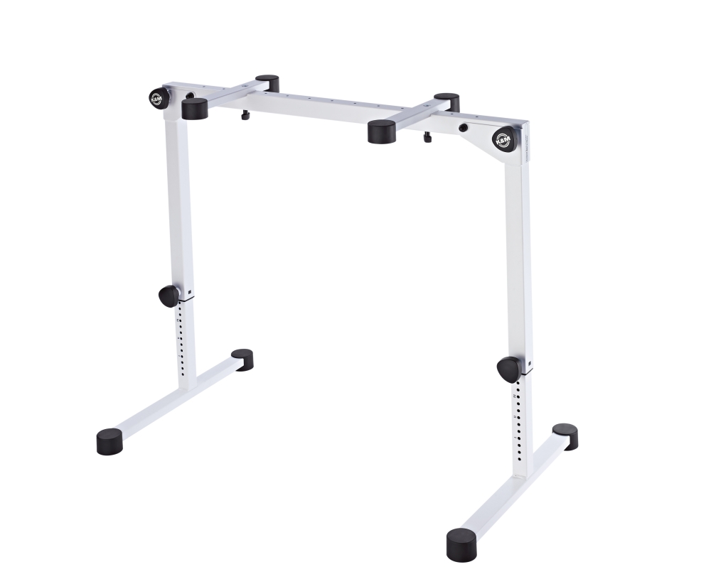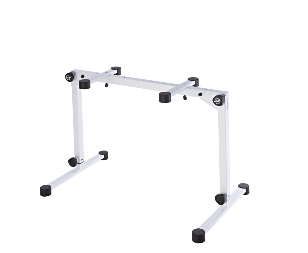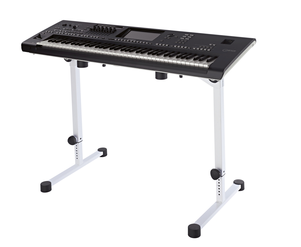 A kisméretű acélvázas konstrukció és a nagy padlóvédő lábak a mutatós billentyű állványnak kivételes stabilitást biztosítanak. A rugós rögzítő gombok mindkét oszlopon egyszerű és precíz magasságbeállítást tesznek lehetővé. A hangszertartó karok egyenként a hangszer méretéhez igazíthatók.