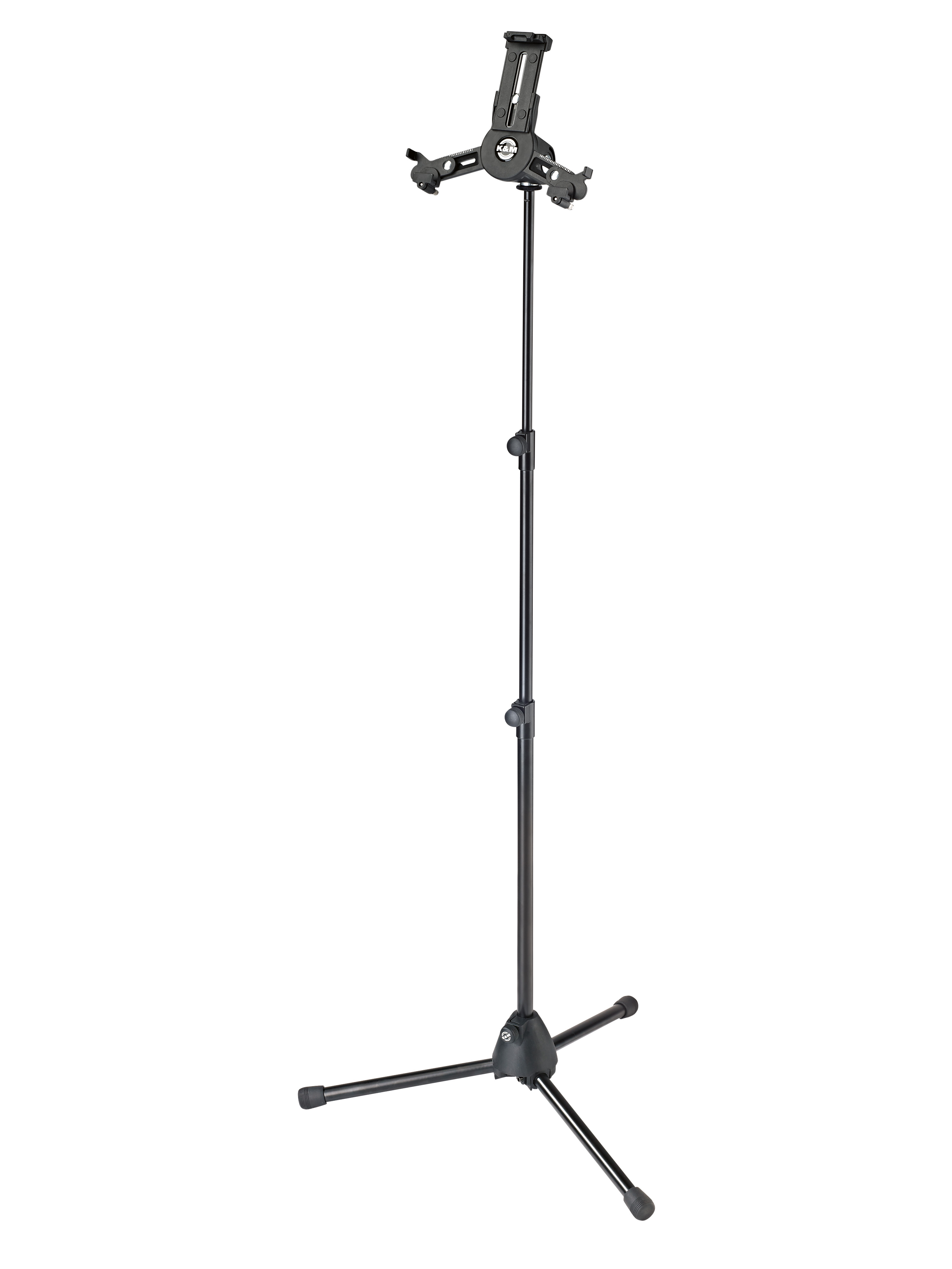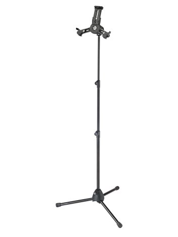 Az állvány és az univerzális tablet tartó kombinációja különféle méretű táblagépekhez igazítható szerszámok nélkül, és biztonságosan tartja azokat a legtöbb alkalmazásban, akár színpadon, akár a próbateremben vagy otthon. Az egyenként állítható tartókarok 163-242 mm magas és 102-189 mm széles készülékeket képesek befogadni (például iPad, iPad 9,7, iPad Pro, Amazon Fire HDX 8,9, Google Nexus 9). A tabletek vastagsága 5-11 mm lehet. Első használatkor a tartókarokat az állítócsavarokkal kell a készülék méretéhez igazítani. A továbbiakban a tabletet csak be kell pattintani a helyére, ez maximális sokoldalúságot és mobilitást eredményez. A dőlésszöget szárnyasanya segítségével szabályozhatjuk, minden felhasználó könnyen megtalálhatja a számára ideális helyzetet. A táblagépet álló vagy fekvő helyzetbe fordíthatjuk, szilárdan a helyén marad, nem kell félnünk a véletlen elfordulástól.