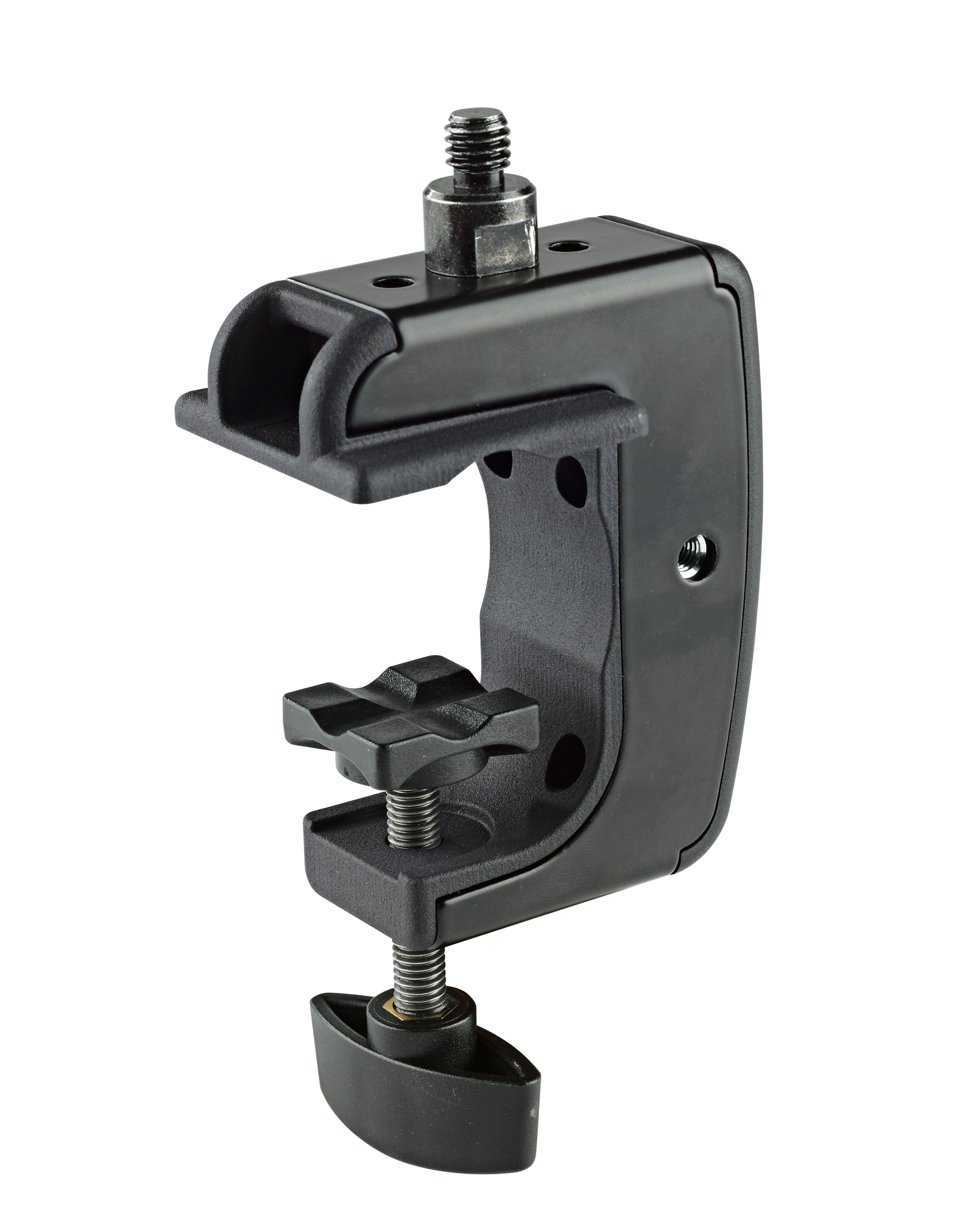 A mellékelt univerzális csavarkulcs segítségével a menetes szorítócsavar négy különböző helyzetben rögzíthető. A szorítóelem kibővíthető további 1/4”, 3/8”, 5/8” méretű menetes csavarokkal. 10-51 mm-es átfogásával a szorítóelem széles spektrumban alkalmazható rögzítésre. A stabil fém konstrukció a kiváló minőségű műanyag betétekkel biztos és erős tartást garantál. Az okosan kialakított formának köszönhetően sík felületen és csöveken egyaránt alkalmazható.