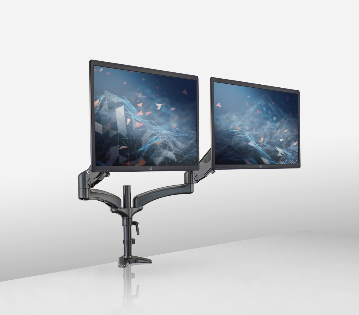Egyedi megoldás a munkaterület kialakításához. Az asztali rögzítővel helytakarékos és ergonomikus módon helyezhetjük el a két, legfeljebb 32”-os monitorunkat. Mindkét masszív alumínium szerkezet és a beépített gázrugó 8 kg-mal terhelhető. A készülék rögzítő panelek VESA 75/75 és 100/100 mérethez alkalmasak. A nagy és stabil asztali szorítóelemnek (max. 60 mm vastagság) köszönhetően a teljes tartó gyorsan felszerelhető és sokoldalúan használható. Itt 200 mm-es magasságállításra van mód, mindkét felső kar további 350 mm-t tesz lehetővé. A fejrészek külön dönthetők és forgathatók a legmegfelelőbb látószög és testhelyzet érdekében. A belső kábel elvezetés professzionális, rendezett munkaterületet biztosít.