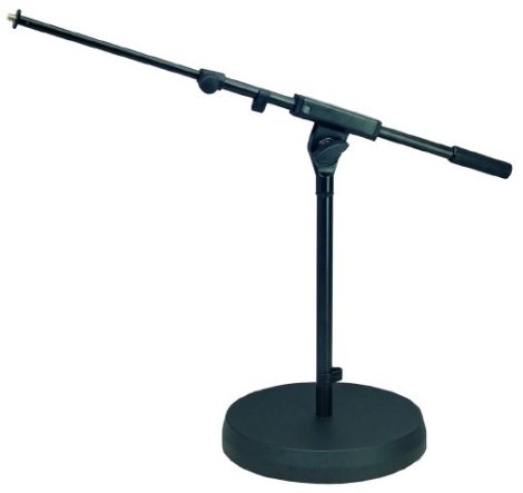 Alacsony, kerek talpú mikrofonállvány teleszkópos gémmel, lábdobokhoz és akusztikus hangszerekhez.