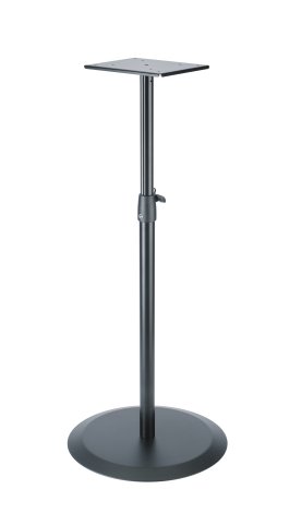 Elegáns padlóállvány nagy, lapos öntöttvas kerek talppal, közeltéri monitorokhoz és hangszórókhoz. A tömör acélszerkezet nagyon stabili, és biztonságosan tartja a hangszórókat és a monitorokat a kívánt helyzetben. A 205 x 245 mm-es tartólemez egyszerűen rácsavarható a 3/8"-os menetes csatlakozásra. Hangszórók és monitorok közvetlen rögzítésére, valamint Genelec és más gyártók szerelőlapjaihoz is használható. Az optimális hallgatási magasság érdekében 50 mm-es lépésekben 950 és 1450 mm között állítható. A karcsú, biztonsági retesszel ellátott bilincs 35 kg-os teherbírást tesz lehetővé, ha a terhelés középre van állítva.