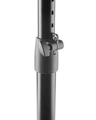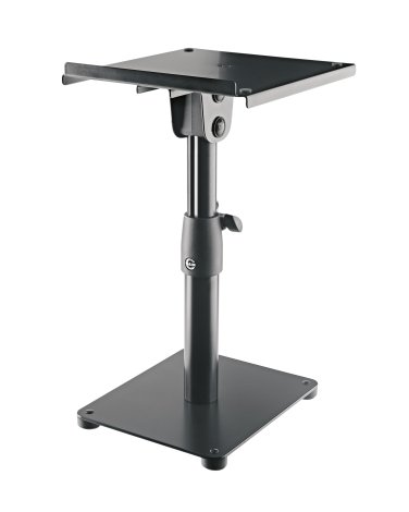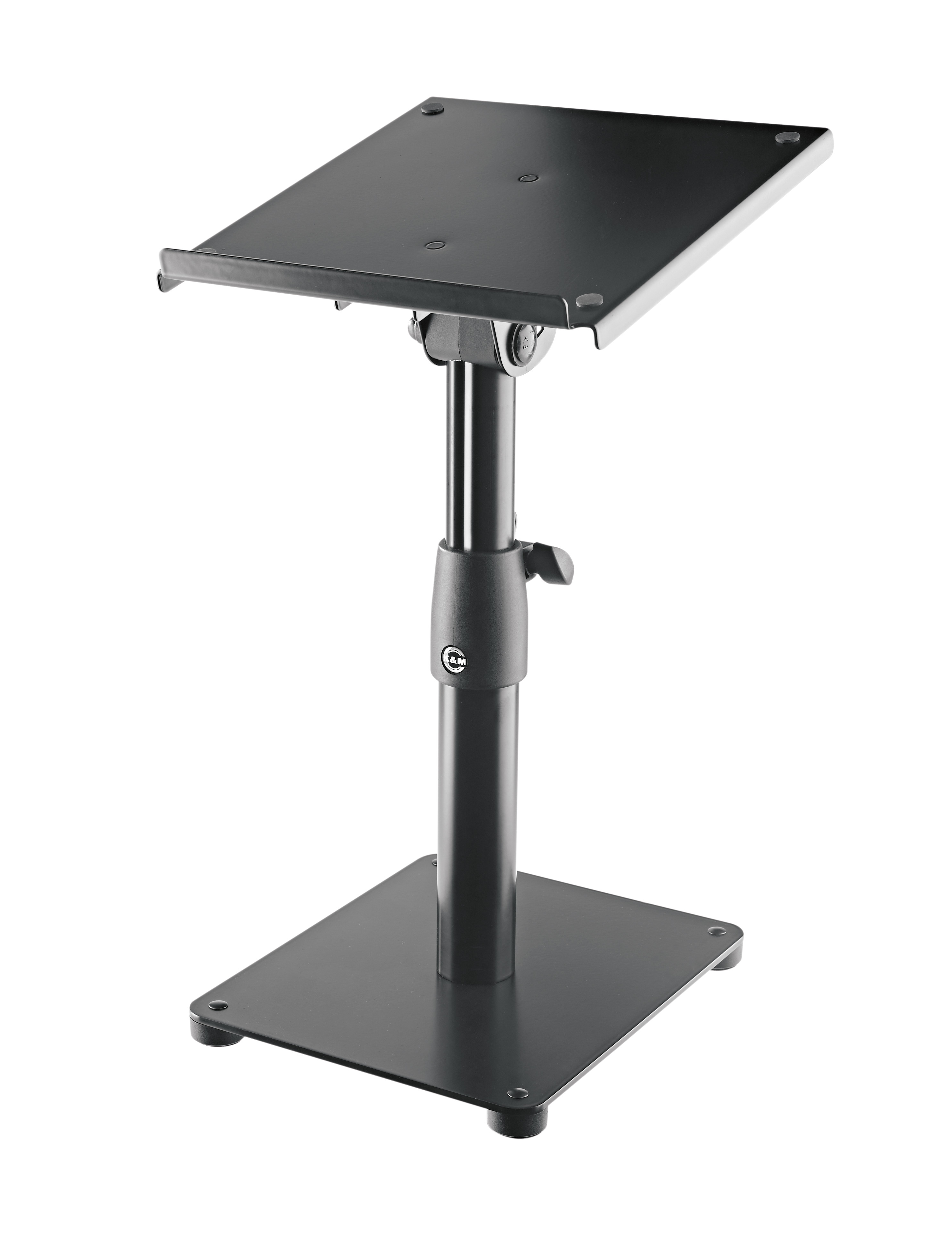 Állítható magasságú, asztali állvány dönthető tartólappal. A masszív fémszerkezet a nagyméretű tartólappal (230 x 250 mm) stúdiómonitorok és más, hasonló méretű berendezések széles választékához alkalmas. A tartólap fokozatmentesen 12,5°-ig dönthető és a súlypont optimalizálása érdekében mozgatható. Egy perem biztosítja a megfelelő biztonságot, megakadályozza a monitor lecsúszását. Az alaplap alján négy filccel bevont gumiláb biztosítja az asztallaptól való elszigetelést. A magasság 4 fokozatban állítható 350 és 450 mm között. Az állvány 25 kg-ig terhelhető. A monitorok biztonságos, zajszigetelő alátámasztásához gumipárnákat mellékelnek.
