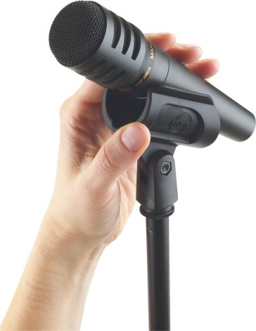 Újszerű, rugalmas konstrukciójának köszönhetően a mikrofont nem becsúsztatni kell a kengyelbe, hanem a közepén bepattintható a helyére és ugyanilyen könnyen ki is emelhető onnan.