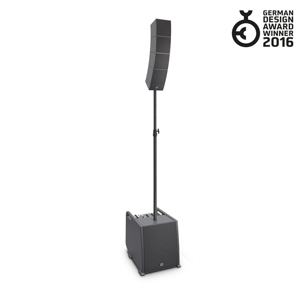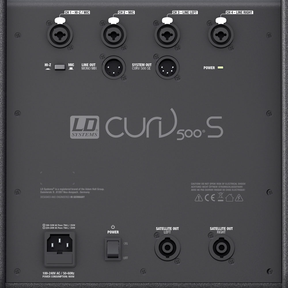 Mélynyomó csatlakozók: 1x Mic/Hi-Z (XLR/6,3 mm jack combo), 1x Mic (XLR/6,3 mm jack combo), 2x Line (XLR/6,3 mm jack combo), 3,5mm jack, 2 x Array Satellite Out (Speakon kompatibilis), Line Out (XLR), System Out (ötpólusú XLR)