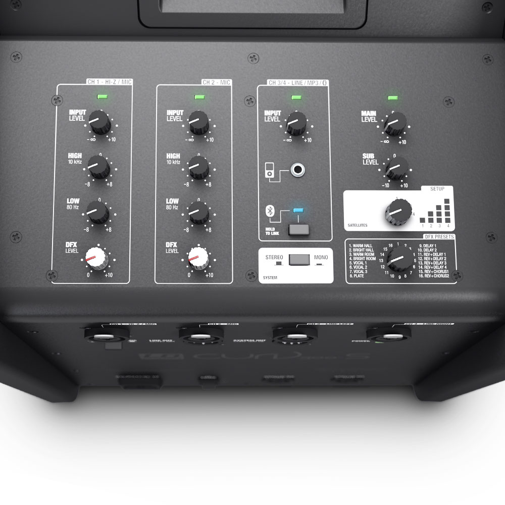 Mélynyomó kezelőszervek: bemeneti szint (1-4 csat.), Hi-Z, magas/mély EQ (1-2 csat.), DFX (1-2 csat.), DFX preset, DSP preset, Bluetooth link, monó/sztereó, szub hangerő, fő hangerő