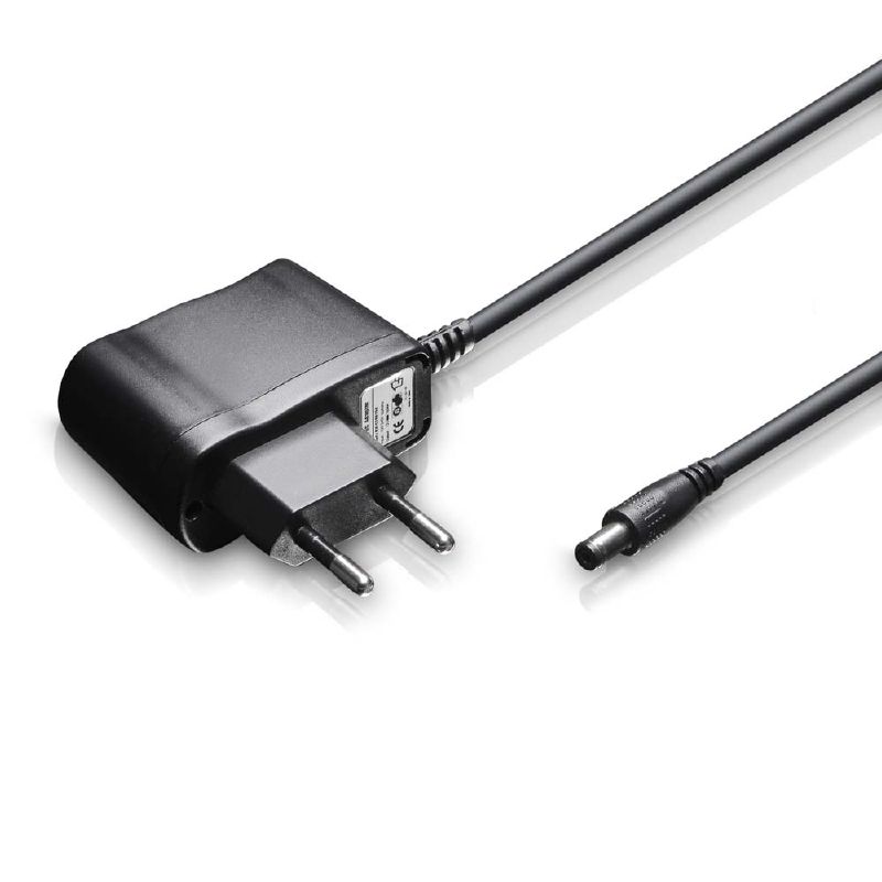 Az LD Systems PPA 2 12 voltos hálózati adapterrel működik, fényes LED jelzi a tápfeszültséget a masszív fém készülékház tetején.