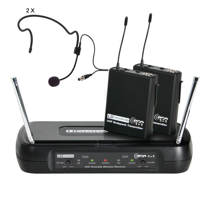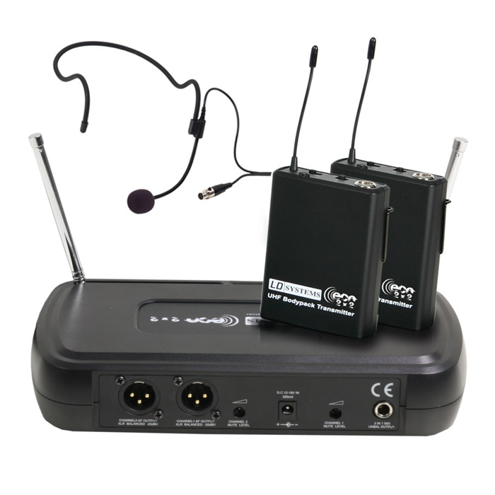 Kétcsatornás diversity rendszerű UHF vezeték nélküli készlet beltpackkel, 2 fejmikrofonnal