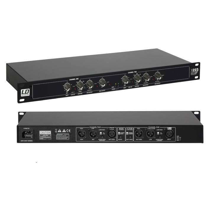 Az LD Systems X223 sztereó kétutas/monó háromutas keresztváltó 19” 1 U méretben. Strapabíró felépítése, kiváló minőségű robusztus gombjai, valamint a beépített tápegysége ritkaság ebben az árkategóriában. Monó sub kimenetet, minden csatornán szabályozható crossover frekvenciát, szabályozható alacsony- és magasfrekvenciás, valamint bemeneti érzékenységet, fázisfordító kapcsolót, kapcsolható 40 Hz-es felüláteresztő szűrőt és szimmetrikus XLR be/kimeneteket kínál. Az LD Systems X223 professzionális igényeket kielégítő kiváló minőségű és hangzású készülék.