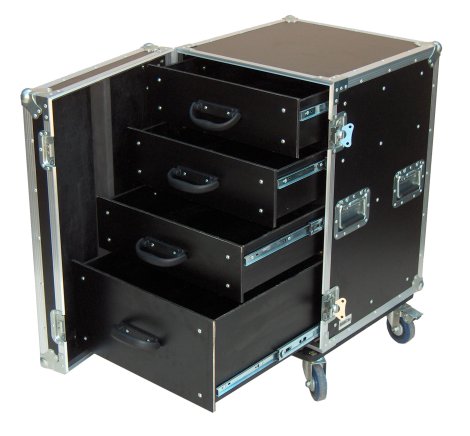 Az RO-DR001 típusjelű fiókos rack dupla falú alumínium profilokból és a 9 mm vastag, fekete színű műanyag bevonattal ellátott rétegelt falemezből készül. A test 4 darab, görgős acél síneken teljesen kihúzható, béleletlen fa fiókot (1x7U + 3x3U méretűt) rejt. A láda erős, nagy teherbírású, a napi munkára tervezett. A zongorazsanérokon nyíló ajtót, 2 darab lakatolható pillangózár rögzíti. A mozgatást 4 darab süllyesztett acélfül és 4 darab külön lapra szerelt kerék segíti, amelyek közül kettő fékezhető.