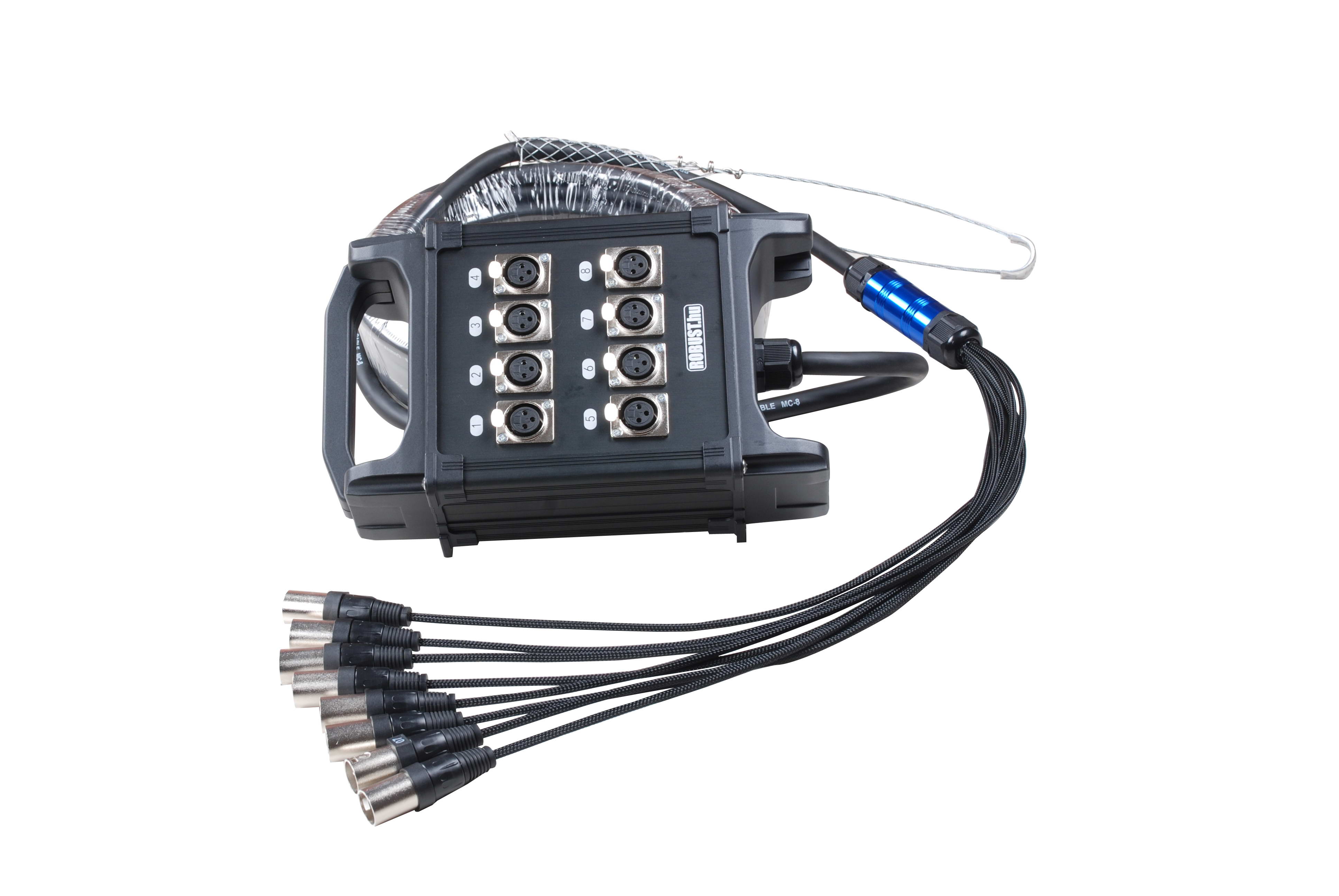 A kiváló minőségű, hajlékony csoportkábel egy tömszelencén keresztül fixen kapcsolódik a dobozhoz, másik végén XLR csatlakozóval szerelt legyezőben végződik. A legyező kifejtési pontját fém burkolat, a legyező minden szálát kábelvédő harisnya, a csatlakozókat acél tehermentesítő védi a sérülésektől. A csatornák azonosítását a kábel mindkét végen elhelyezett számozás segíti.