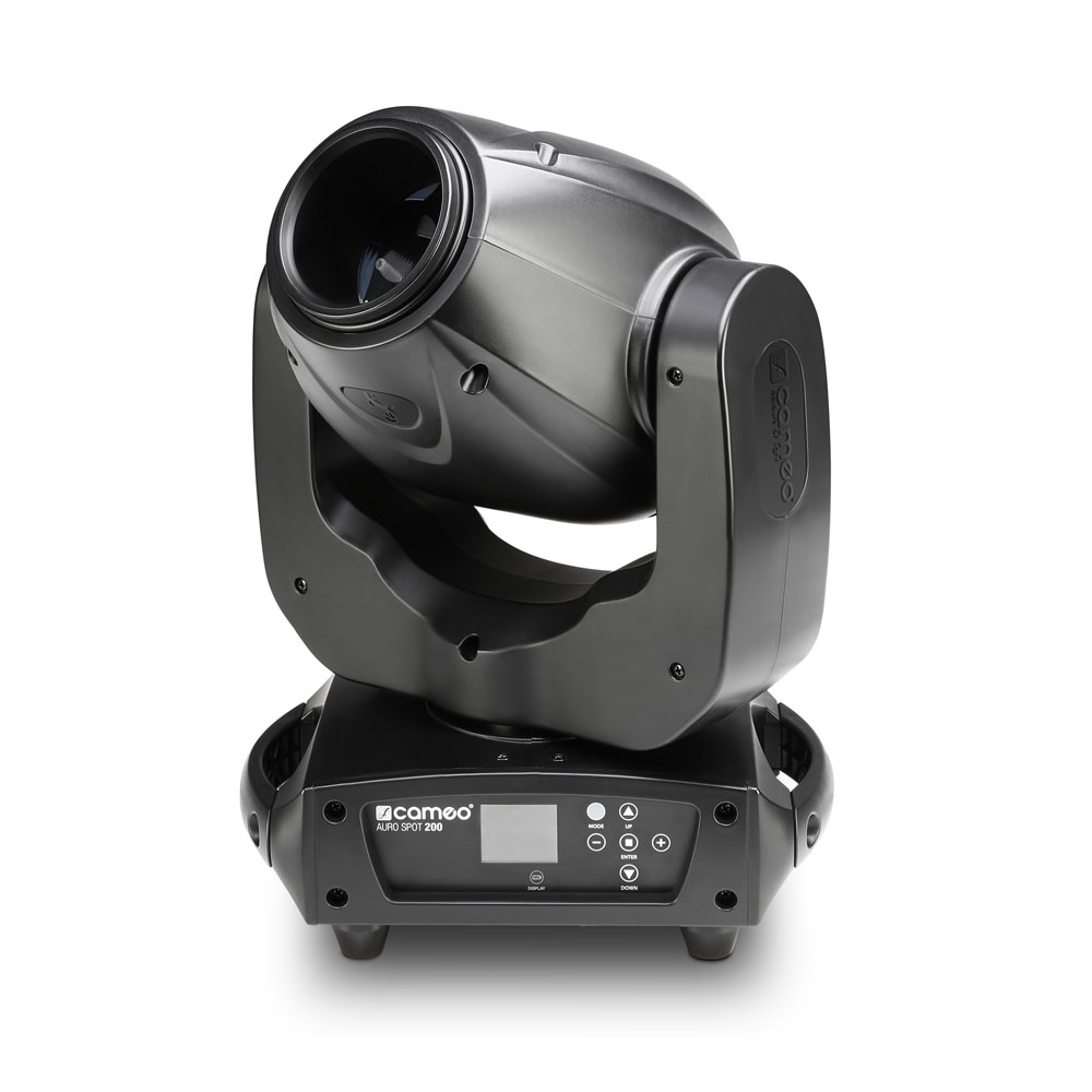 A Cameo Auro Spot 200 RDM-képes lámpa ultra fényes mozgó fejjel, 16 bites felbontással, 630° vízszintes és 235° függőleges mozgástartománnyal és nagysebességű háromfázisú motorral. Egy darab 100 wattos LED-et építettek bele, nyolc élénk színt, fehér fényt, osztott színeket, hat cserélhető gobót és háromoldalú forgó prizmát kínál látványos effektek létrehozására.