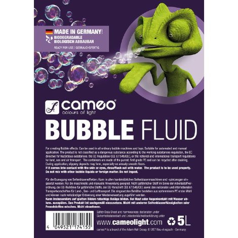 A Cameo Bubble Fluid kifejezetten professzionális szappanbuborék fújó gépekhez készült, hosszantartó, szagtalan buborékok létrehozására alkalmas. Használatra kész állapotú, biológiailag lebontható, folyamatos német minőség-ellenőrzés mellett készül.