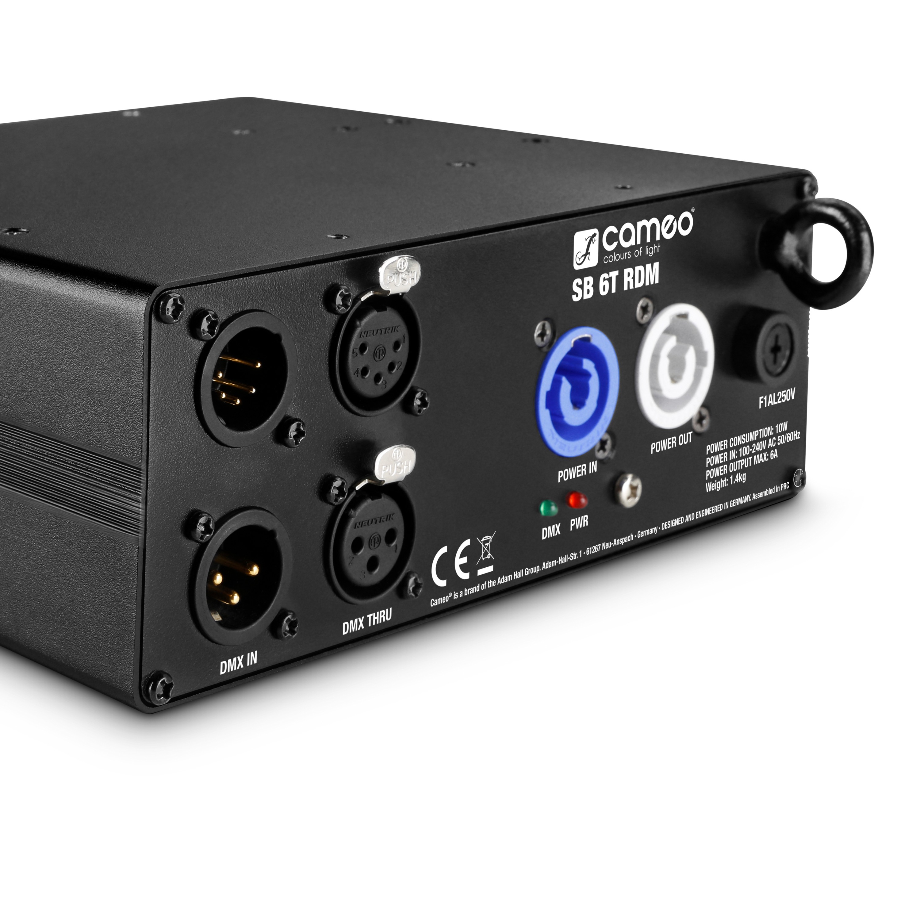 A professzionális felhasználásra és kétirányú kommunikációra tervezett Cameo SB 6T RDM készülék 6 kimenettel rendelkező DMX/RDM splitter két bemenettel és két párhuzamos thru kimenettel. A bejövő DMX/RDM jelet hat külön kimeneti portra küldi, amelyek elektronikusan és optikailag izoláltak. Mindegyik kimeneti csatorna képes felerősíteni a DMX/RDM jelet az eredeti szintre. Minden bemenet és kimenet 3 és 5-pólusú Neutrik csatlakozót kapott a maximális sokoldalúság és megbízhatóság érdekében. Az előlapon és hátlapon lévő LED-ek a tápfeszültséget és a DMX állapotot jelzik, három M10 menetes csavarhüvely pedig a hídra szerelést könnyíti meg. A Cameo SB 6T RDM-hez powerCON hálózati kábel jár.