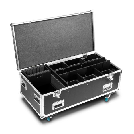 Ez a masszív flight case ideális megoldás összesen hat darab Cameo Zenit B60 Par lámpa biztonságos szállítására, tárolására és töltésére. A láda 7 mm-es nyír rétegelt lemezből készült szivacs béléssel és megbízható Adam Hall hardverekkel, beleértve a nyolc rugós szállító fület és a négy strapabíró önbeálló 100 mm-es kereket. A ládában külön rekesz található a kiegészítőknek, egy kivehető doboz 12 fényterelő diffúzor számára, tetején pedig tálcák találhatók a ráhelyezett másik láda kerekeinek fogadására. Teljes egészében be van kábelezve az elemről üzemelő lámpatestek kényelmes, a tárolás alatt történő töltése érdekében.