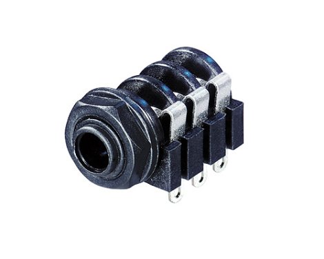6,35 mm sztereó aljzat - beépíthető, 3-szoros kapcsoló, vízszintes nyákhoz, (távolság 8,2 mm) műanyag ház, ömlesztett