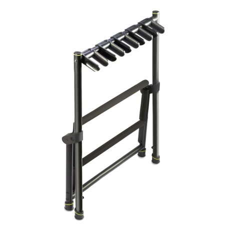 Az elektromos, akusztikus és basszusgitárhoz is alkalmazható gitárállvány 3, 5, 7 vagy 9 hangszer befogadására alkalmas változatban kapható. A váz erős acélcsőből készült fekete porfestett felülettel. A nyakat szorosan és biztonságosan tartó állítható kengyelek puha felületűek és levehetők. A gitár testével érintkező és azt tartó elemek speciális habanyaggal vannak bevonva, védelmet nyújtanak az ütődések és karcolások ellen. Az állvány a szállításhoz és tároláshoz könnyedén összecsukható.
