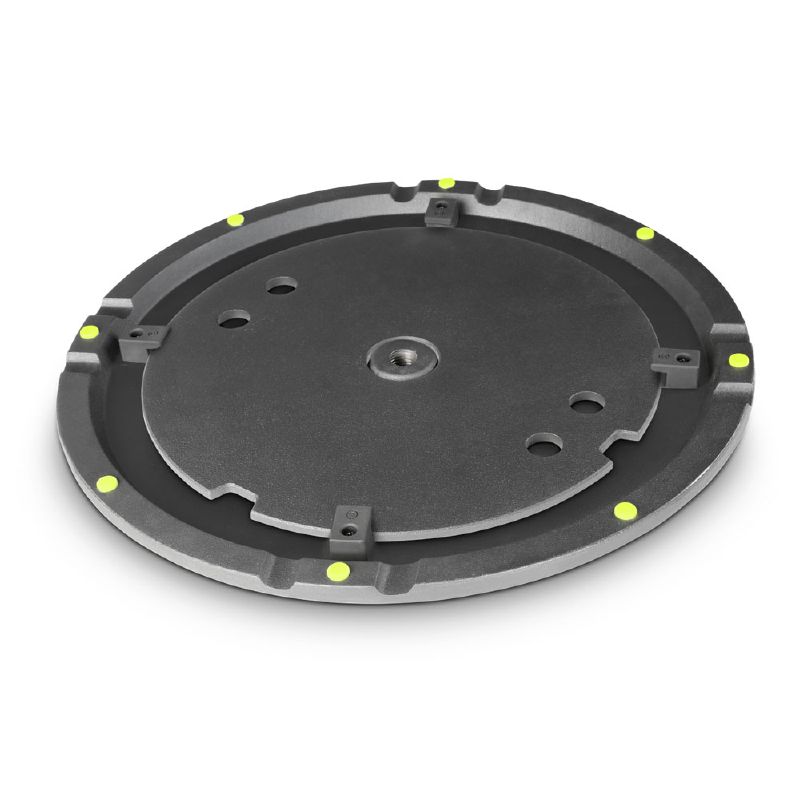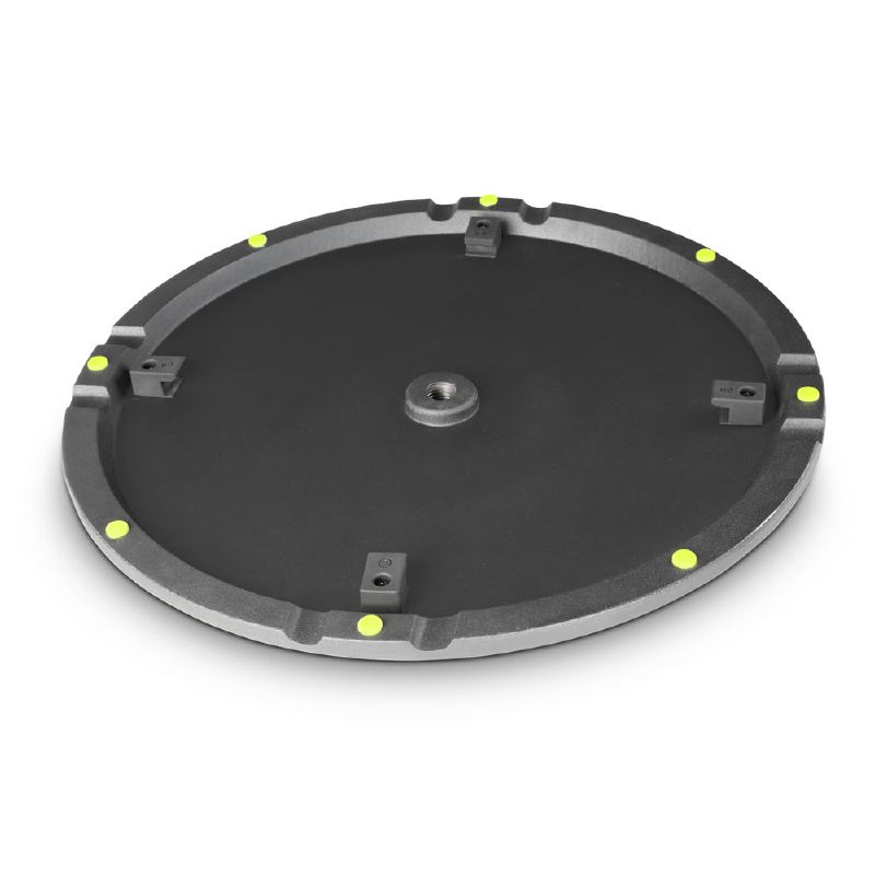 A hagyományos háromlábú állványoknál kisebb alapterületet foglal ez a súlyos körtalpas hangfalállvány, amely 35 mm-es acél rúddal, törhetetlen acél rögzítővel, ergonomikus állító csavarral és biztonsági tüskével rendelkezik az egyszerű és biztonságos magasságállítás érdekében. Magassága 1,05 métertől 1,8 méterig emelhető 7,5 cm-es lépésekben. A súlyos, alacsony profilú, 9 kg tömegű öntöttvas talp további 5 kg-os tárcsával egészíthető ki a stabilitás növeléséhez. Az állvány terhelhetősége 25 kg