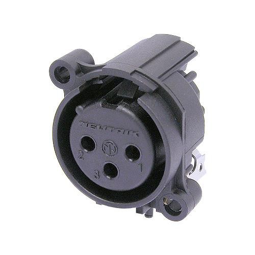 3 pólusú XLR aljzat vízszintes nyákhoz, közösített 1. láb+GND+ház érintkezővel, retesz nélkül A ház