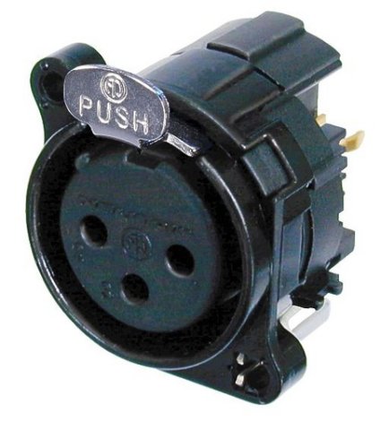 3 pólusú XLR aljzat fekete, függőleges nyákhoz, külön GND és ház, retesz-szemmel, B ház