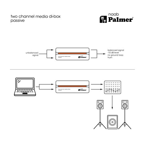Ha laptopot csatlakoztatunk hangrendszerhez, a hangminőség sok esetben hagy kívánnivalót maga után. Zúg és recseg, néha a mély és magas frekvenciákon is gyengül a hang. A Palmer naab, egy kétcsatornás média DI-box megbízható megoldást nyújt erre a helyzetre.
