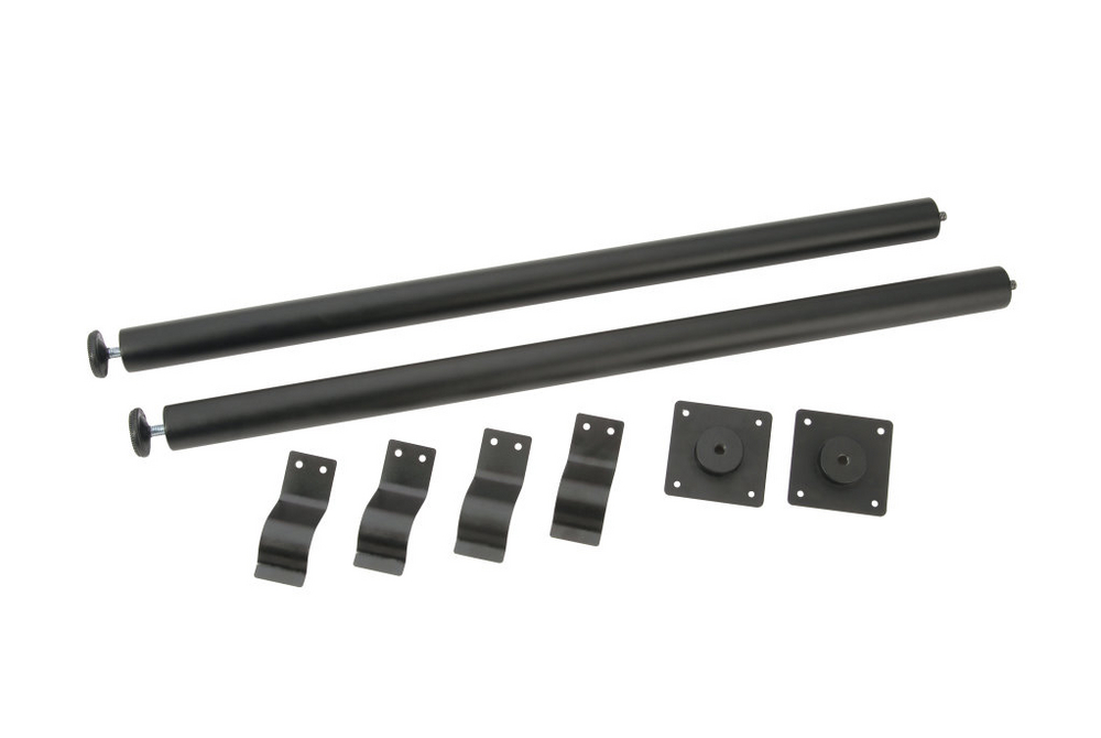 2 darab asztalláb, 30 mm-es magasságállítással, acél szerelőlapokkal és a lábakat becsukott állapotban a fedélhez rögzítő bilincsekkel.