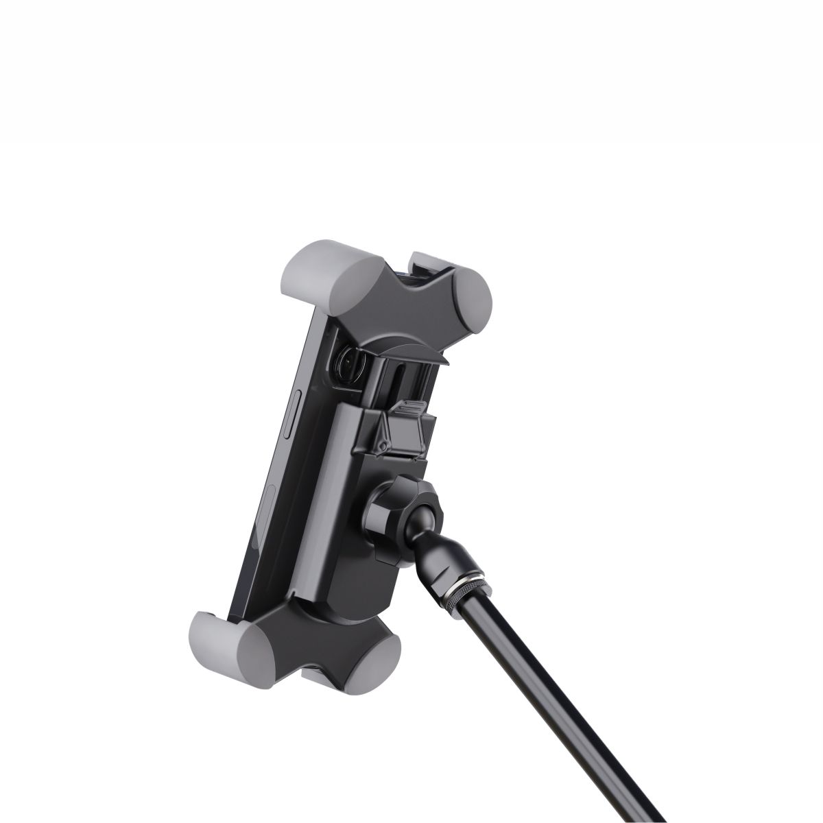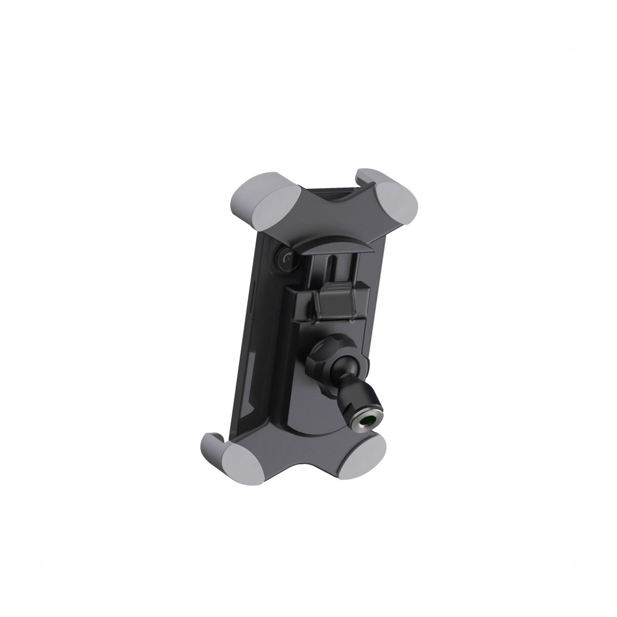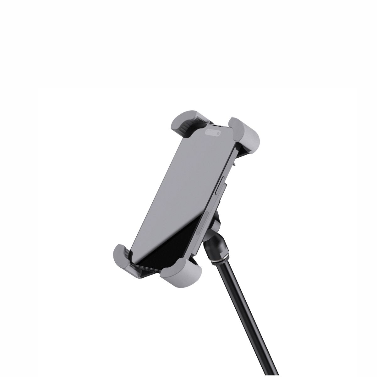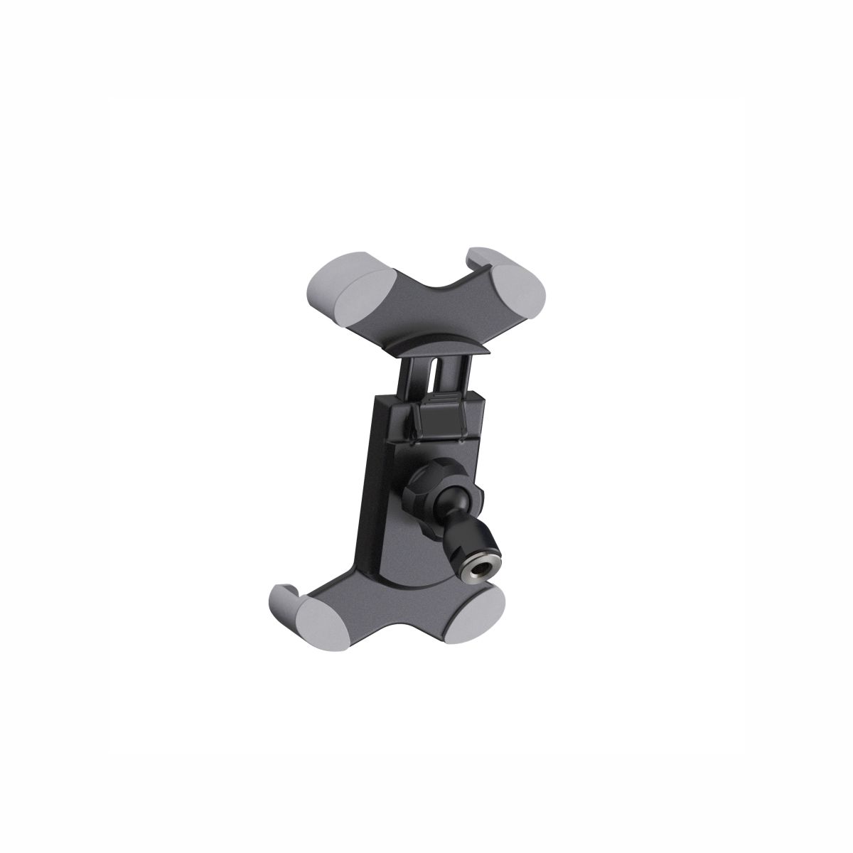 A gömbcsuklónak köszönhetően a tartó fel-le dönthető és 360°-ban elforgatható. A 3/8”-os vagy 5/8”-os menet lehetővé teszi, hogy az okostelefon tartó bármilyen mikrofonállványra, asztali állványra vagy mikrofonrúdra felcsavarozható legyen.