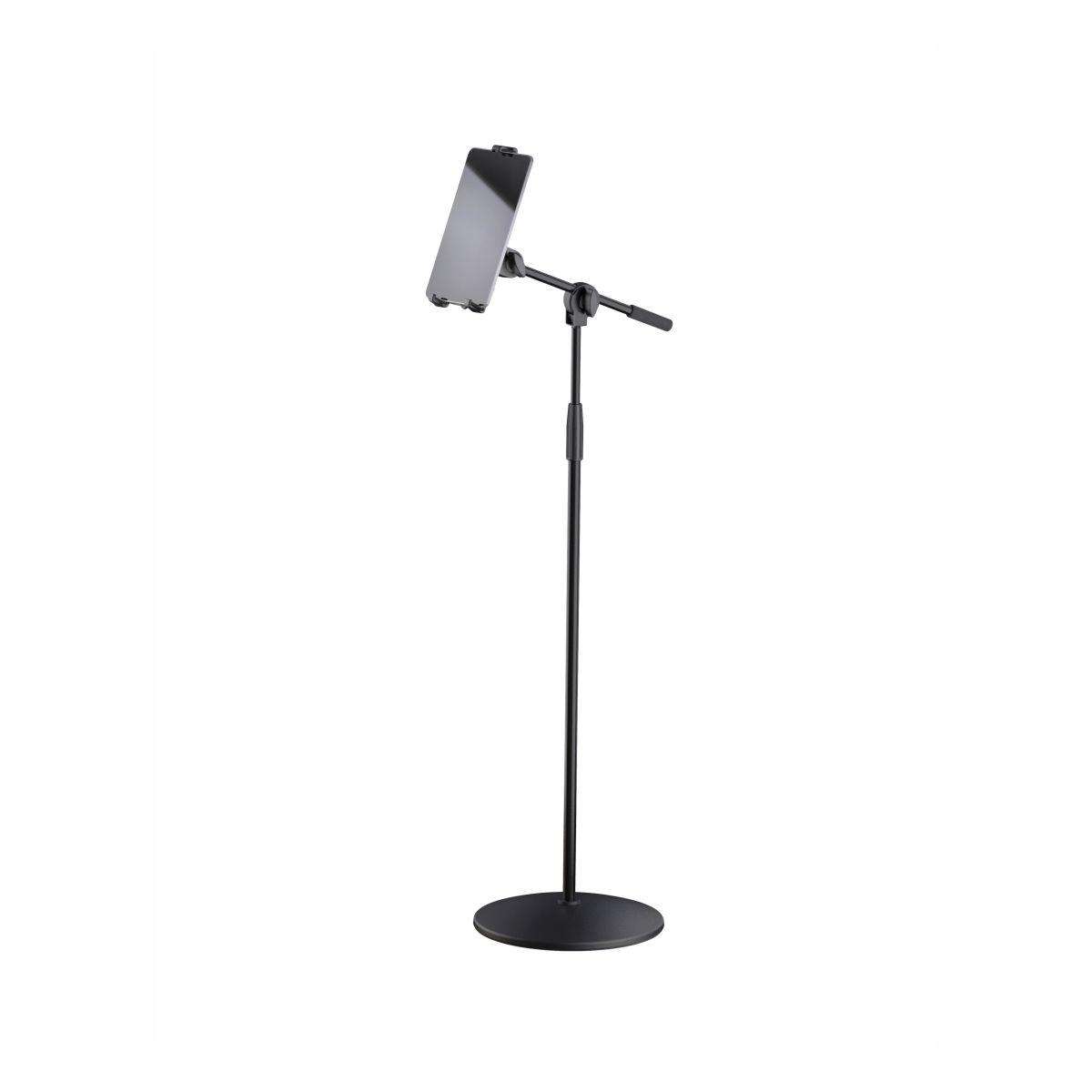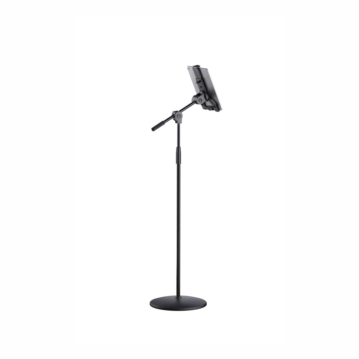 Stabil tablet állvány helytakarékos kerek talppal és gémmel otthoni, stúdióbeli vagy színpadi használatra. A 300 mm átmérőjű 4,5 kg-os öntöttvas talpazat biztos talajt ad az állványnak. Teljesen kihúzva a függőleges gémmel együtt 1430 mm maximális magasság érhető el.