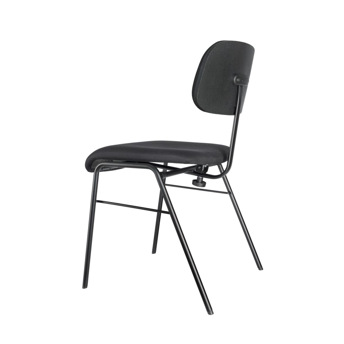 Professzionális zenekari szék állítható ülésdőléssel. A kárpitozás és a szövet (Trevira CS) tűzálló anyagból készült. A fokozatmentes dőlésszög beállítása lehetővé teszi, hogy optimalizáljuk az egyéni üléspozíciót, így hozzájárulva a kellemes közérzethez és egészségéhez. A tartós fekete szövet 100 000 koptatási ciklust is elvisel. A fekete porfestett lábazat robusztus, 2 mm falvastagságú acélcsőből készült. A csendes műanyag csúszkák, az egymásra helyezhetőség és a karcolásvédelem további hasznos tulajdonságok. A csomag része egy készlet gumírozott lábvég is.
