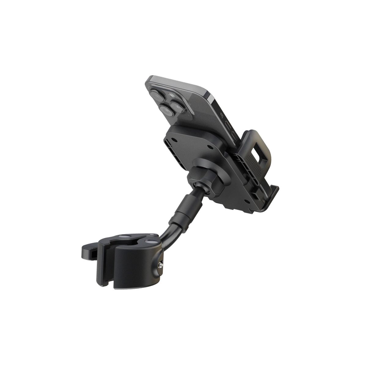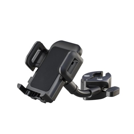 Ezzel az univerzális tartóval okostelefonunk mindig elérhető közelségben van. A tartó alkalmas minden 45 és 90 mm közötti szélességű lapos készülékhez. A kezelés gyors és egyszerű. Helyezzük be az okostelefont - nyomjuk össze a szorító pofákat - kész. A készülék egy gombnyomással ismét kioldható. A beépített gumipárnákkal ellátott szorító pofák biztonságos tartást garantálnak. A mozgatható támaszok szükség esetén teljesen kihajthatók. A gömbcsuklónak köszönhetően a tartó fel-le dönthető és 360°-ban elforgatható. A hajlékony támasztókar további egyéni pozicionálást biztosít. A felhasználóbarát szárnyasanyával ellátott, stabil rögzítőelem lehetővé teszi a gyors felszerelést bármilyen 10-30 mm átmérőjű csőre.