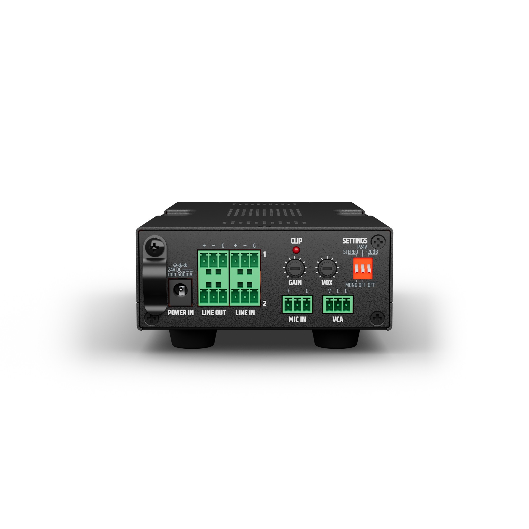 A beépített Audio Ducker funkció automatikusan csökkenti a zene hangerejét, amikor bejelentés hangzik el. Az egyszerű fő hangerőszabályozáshoz vezetékes távirányítót csatlakoztathatunk. A dip-kapcsolók segítségével beállíthatjuk, hogy sztereó vagy monó üzemmódban működjön.