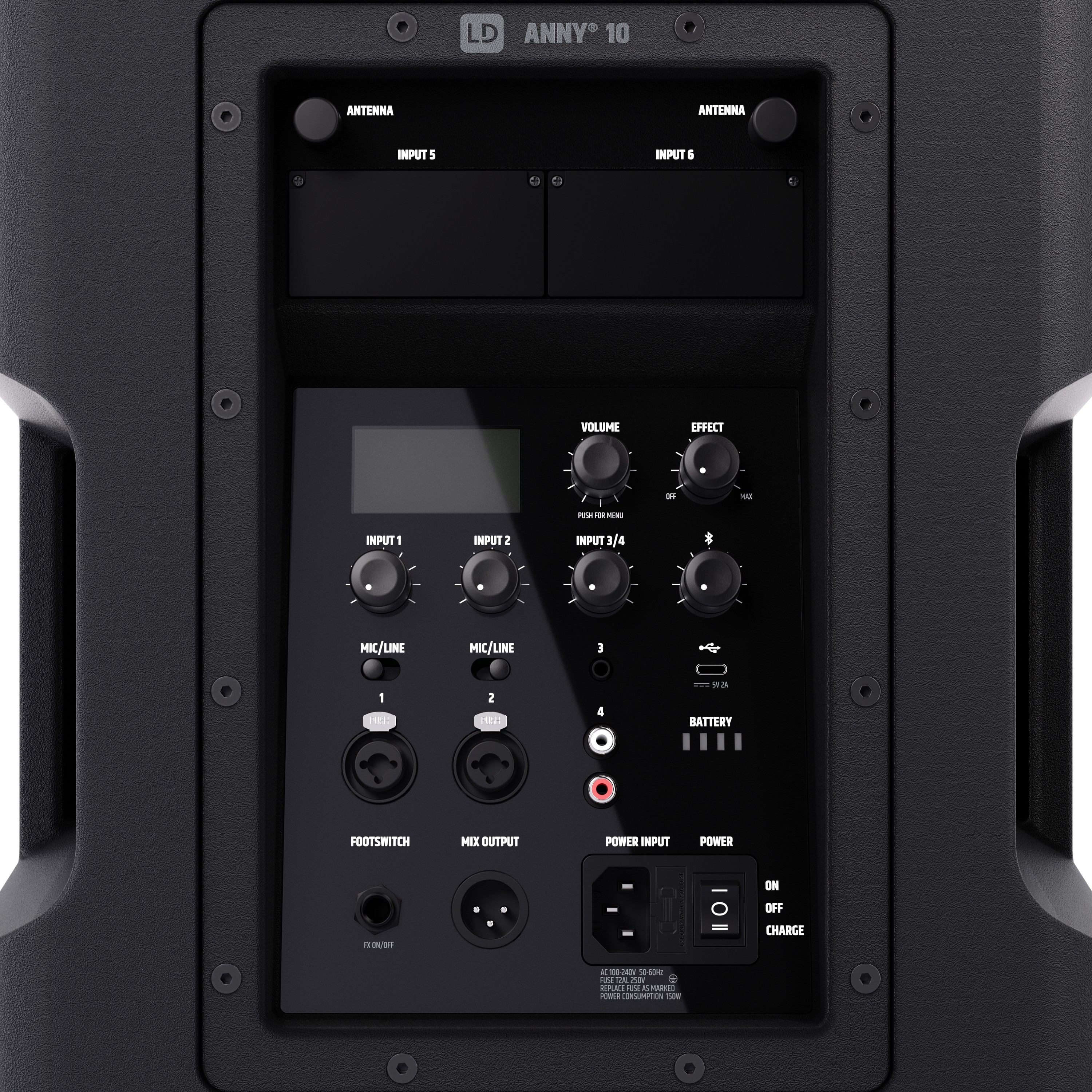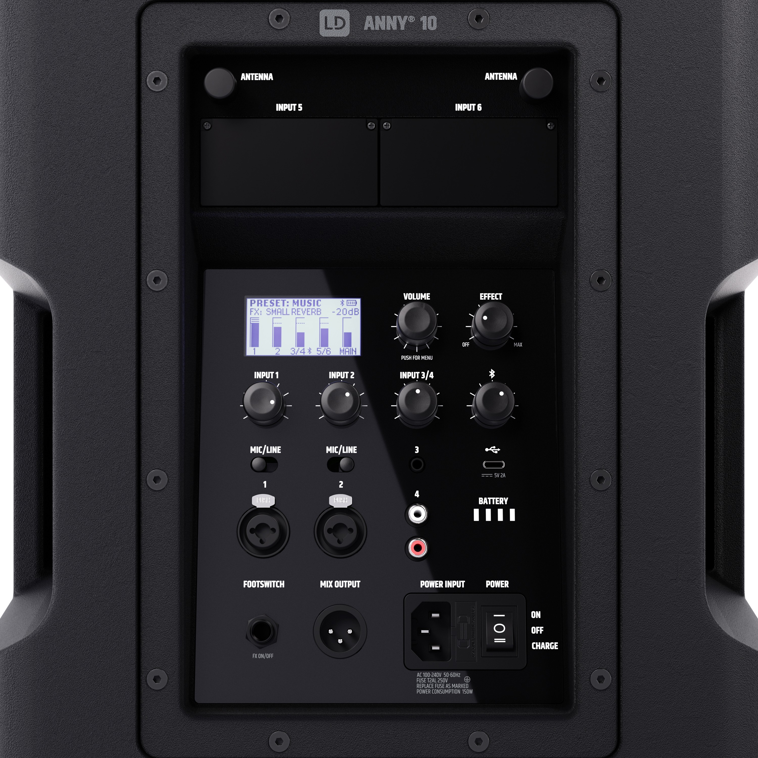 Integrált 6 csatornás keverővel, 3 sávos EQ-val, 5 alkalmazási presettel (MUSIC, LIVE, VOCAL, ECO, FLAT) és olyan effektekkel, mint a reverb és a delay, átfogó funkciókat és kiemelkedő hangminőséget ötvöz kompakt és robusztus kivitelben. Az ANNY 10 sokoldalú csatlakozási lehetőségeivel nyűgöz le: két mikrofon/vonal kombó bemenet, egy sztereó csatorna 3,5 mm-es jack (AUX) és RCA bemenetekkel, valamint Bluetooth 5.0 AAC kodekkel.