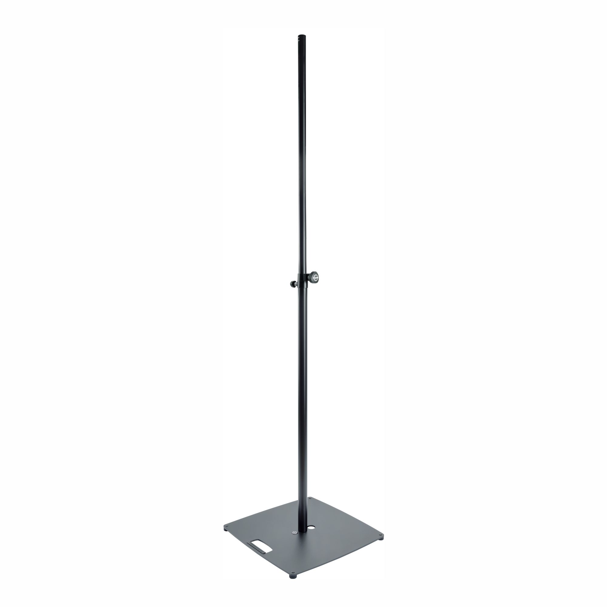Esztétikus állvány lámpák és hangfalak számára. A nehéz, lapos acéllemez talpnak köszönhetően az állvány ott is használható, ahol kevés a hely. A hordozófogantyú, a kábelelvezetés és a négy stabil láb további hasznos funkciók. A magasságot egy biztonsági tüskével rögzíthetjük, és egy halk, holtjátékmentes rögzítőcsavarral szoríthatjuk meg. A bilincs keskeny kialakítása helytakarékos szállítást tesz lehetővé és elegáns megjelenést biztosít. Az alkalmazható magasság 1420 és 2420 mm között van, és öt 200 mm-es fokozatban érhető el. A beépített M10-es menetes persely lehetővé teszi keresztrúd felszerelését vagy a lámpák közvetlen rögzítését. A maximális terhelhetőség teljesen kihúzott állapotban 30 kg.