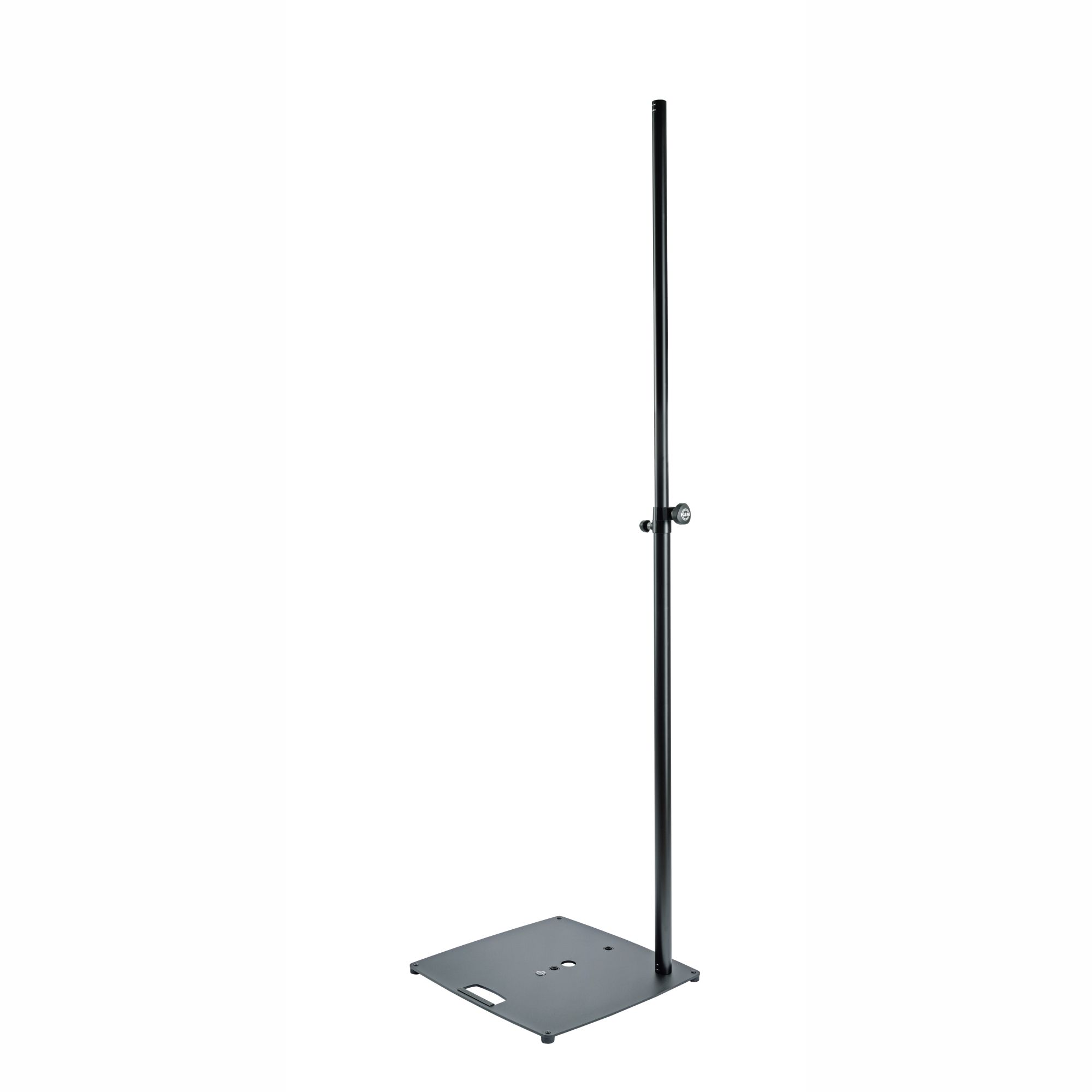 Esztétikus állvány lámpák és hangfalak számára. A nehéz, lapos acéllemez talpnak köszönhetően az állvány ott is használható, ahol kevés a hely. Az igényektől függően háromféleképpen lehet elhelyezni a tartórudat. A középre állított és a középtől eltérő pozíció mellett a rúdkombináció a sarokba is felszerelhető. A hordozófogantyú, a kábelelvezetés és a négy stabil láb további hasznos funkciók. A magasságot egy biztonsági tüskével rögzíthetjük, és egy halk, holtjátékmentes rögzítőcsavarral szoríthatjuk meg. A bilincs keskeny kialakítása helytakarékos szállítást tesz lehetővé és elegáns megjelenést biztosít. Az alkalmazható magasság 1420 és 2420 mm között van, és öt 200 mm-es fokozatban érhető el. A beépített M10-es menetes persely lehetővé teszi keresztrúd felszerelését vagy a lámpák közvetlen rögzítését. A maximális terhelhetőség teljesen kihúzott állapotban 30 kg.