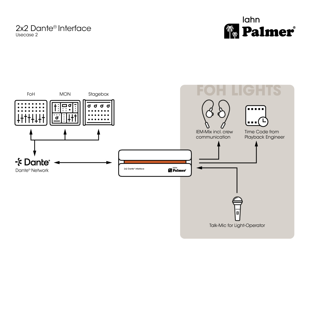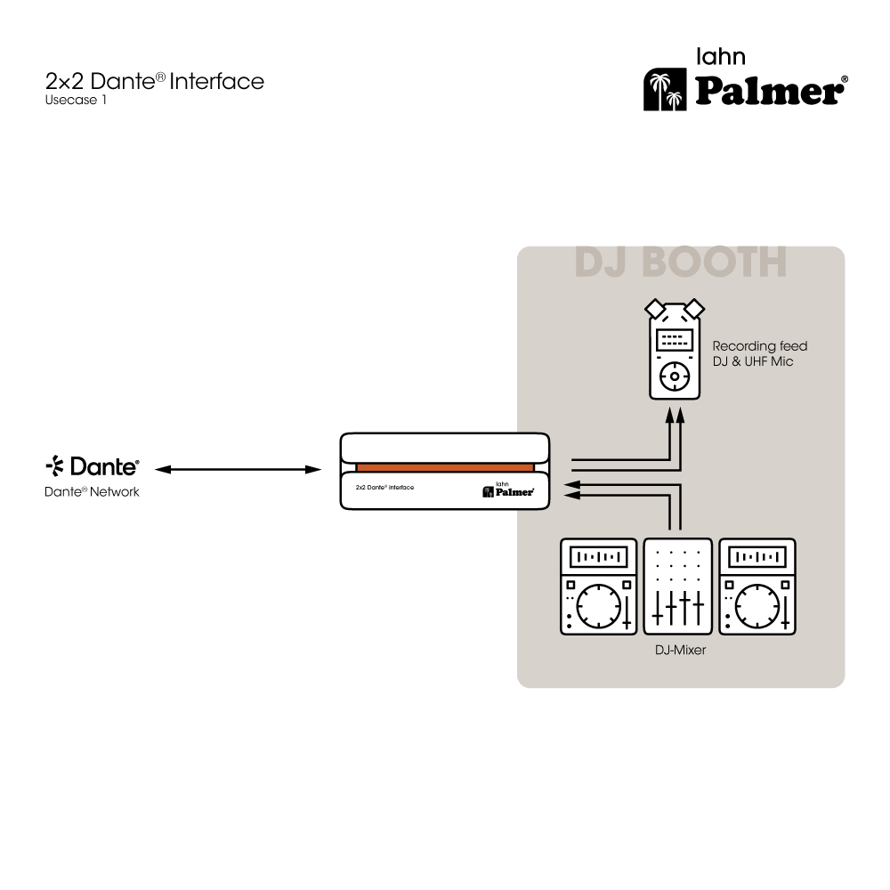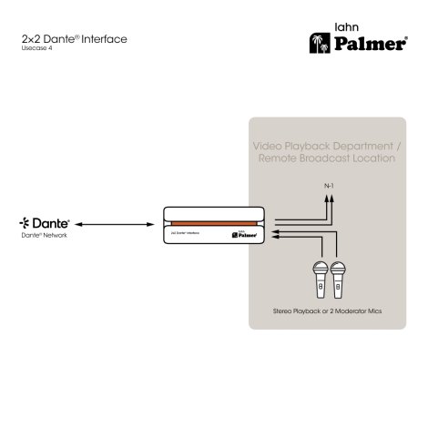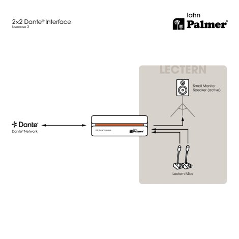 A Palmer RIVER lahn segítségével analóg audioeszközöket integrálhatunk egy Dante® hálózatba: a lahn egy hálózati végpont interfész, amely két analóg mikrofon- vagy vonaljelet küldhet a Dante® hálózatba. A kétirányú funkcionalitásnak köszönhetően a Dante® jelek kiváló minőségű analóg audiojelekké is átalakíthatók, hogy azokat keverőkbe, erősítőkbe vagy hangszórókba lehessen juttatni.