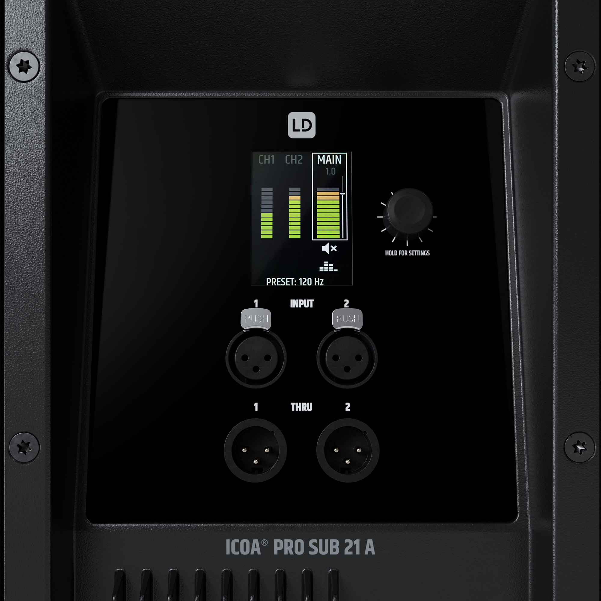 Az intuitív menüben az egygombos vezérléssel ellátott színes kijelző vagy az ingyenes ICOA PRO alkalmazás (iOS/Android) segítségével lehet navigálni. Az alkalmazáson keresztül minden beállítás gyorsan és vezeték nélkül módosítható, és több hangszóró is párosítható egymással. Az alkalmazásban néhány másodperc alatt létrehozható használatra kész sztereó beállítás, akár két top ládával és négy mélynyomóval, beleértve a Bluetooth 5.1-en és TWS-en keresztüli közvetlen zenei streaminget is. A mélynyomó előlapján található állapotjelző LED lehetővé teszi a könnyű azonosítást, és jelzi, ha a limiter aktiválva van.